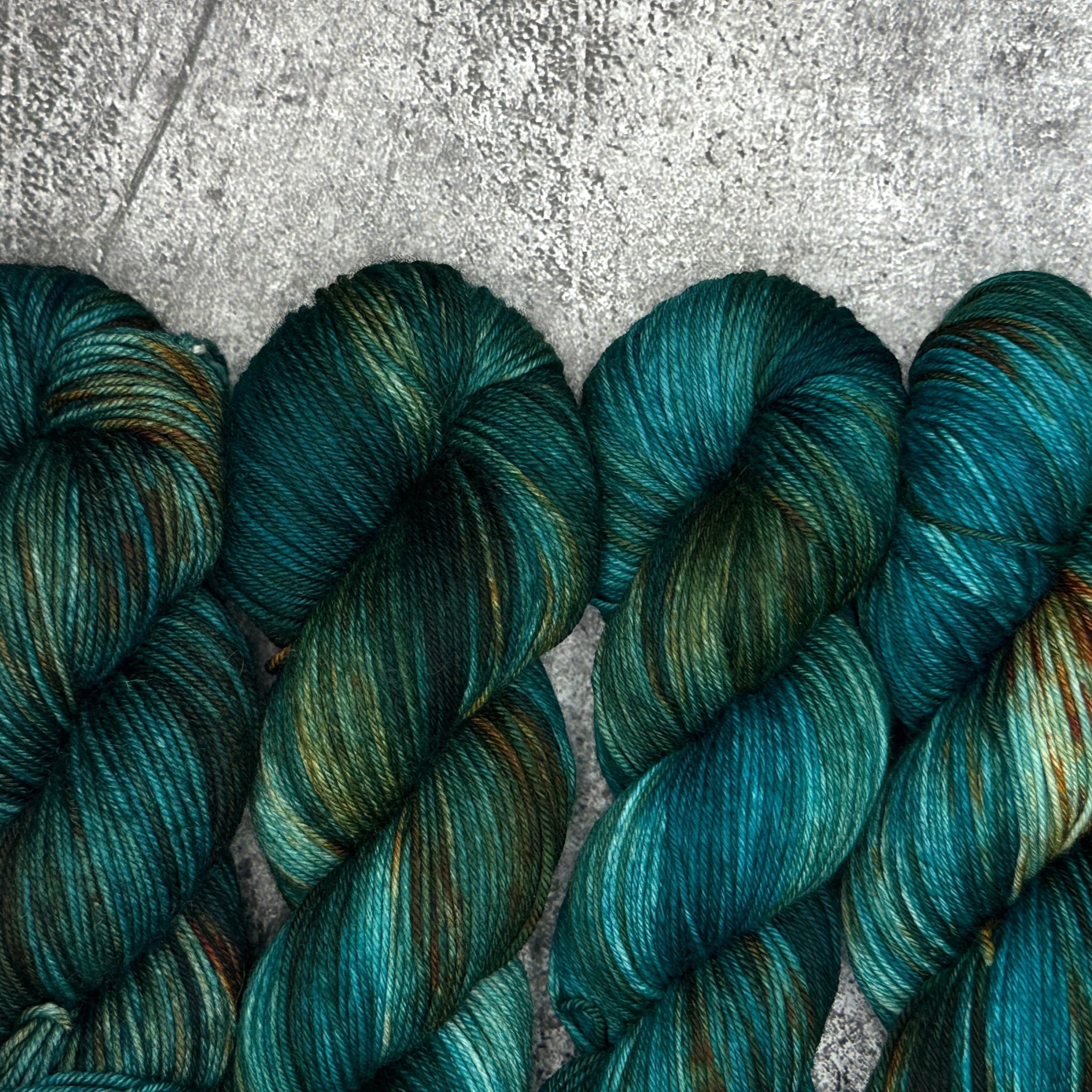 Three skeins of teal yarn with Feisty Fibres labels on a textured gray background